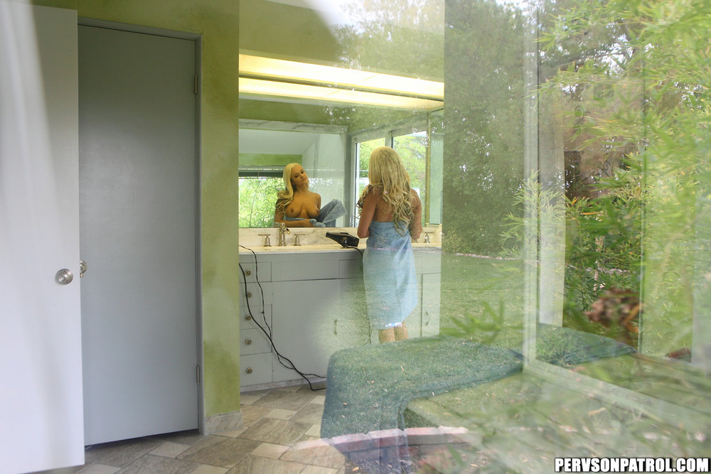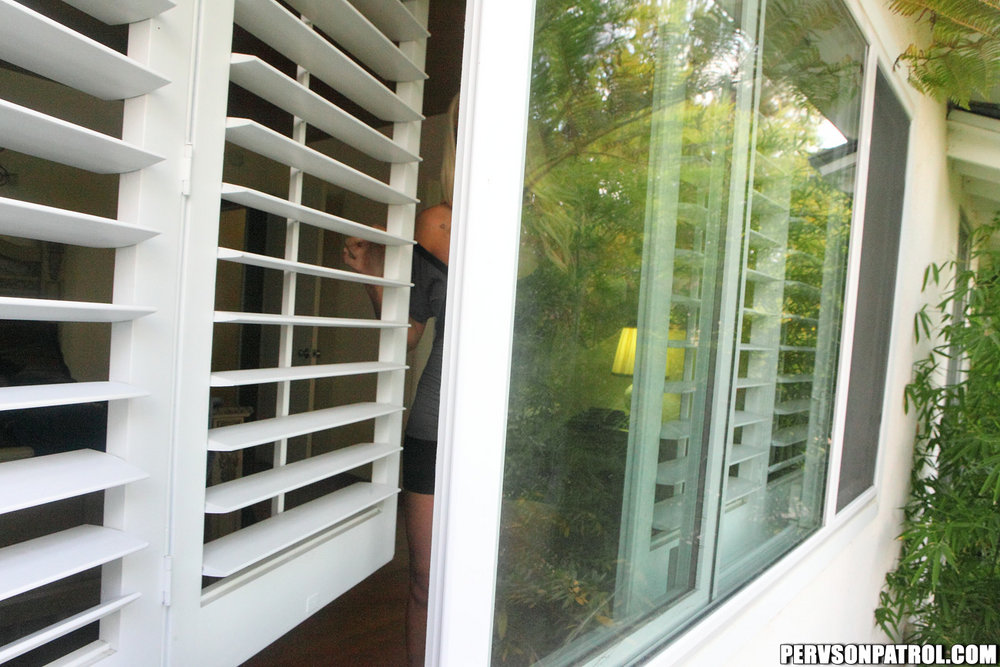 Sneaky voyeur films a blonde babe taking her clothes off before she spots and chases him off.
