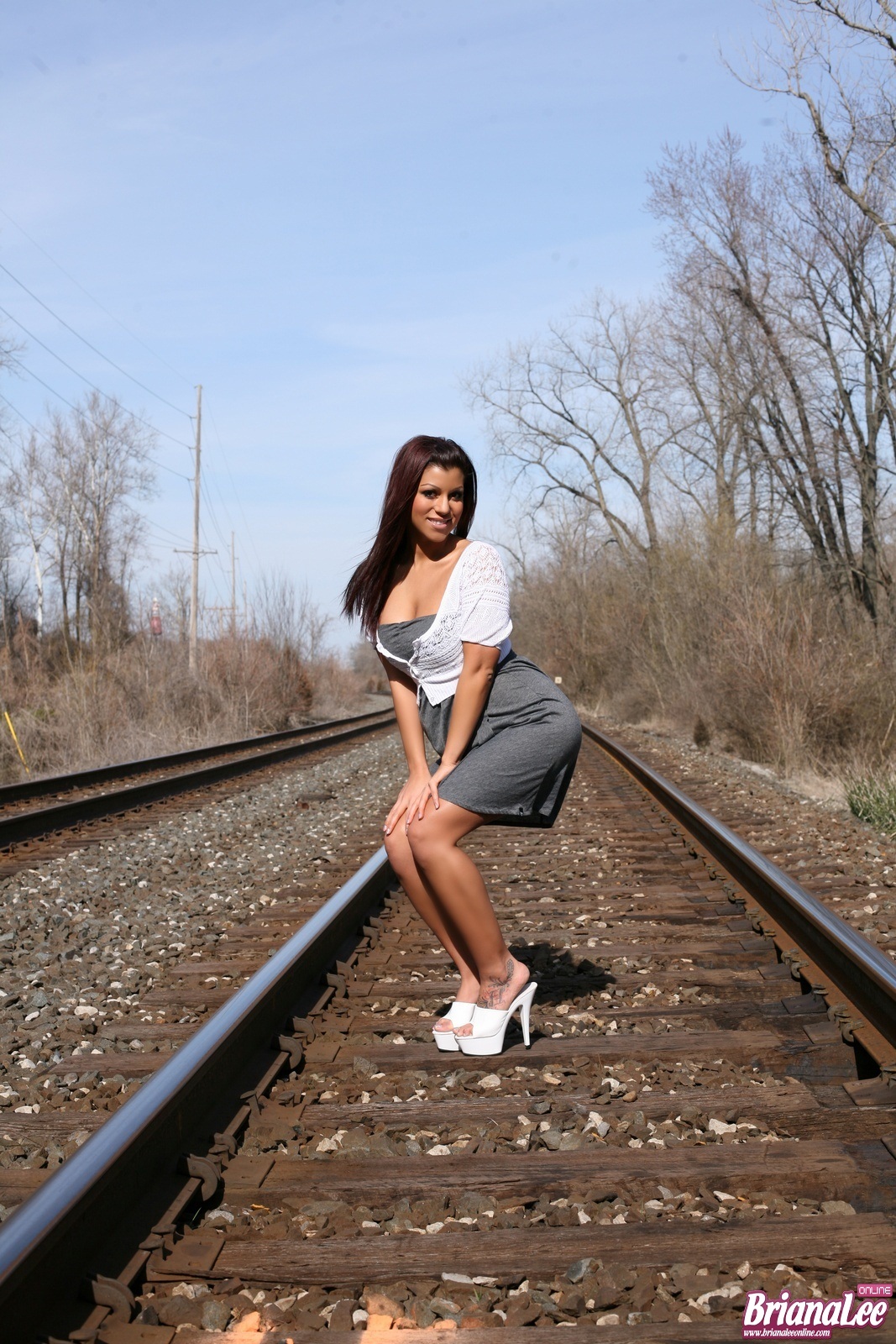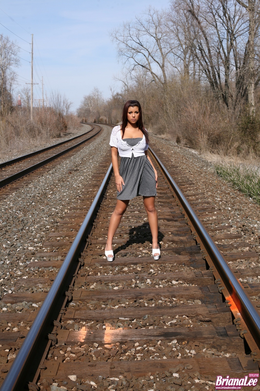 Horny teen chick Briana Lee Online strips on the rail road and shows her ass.