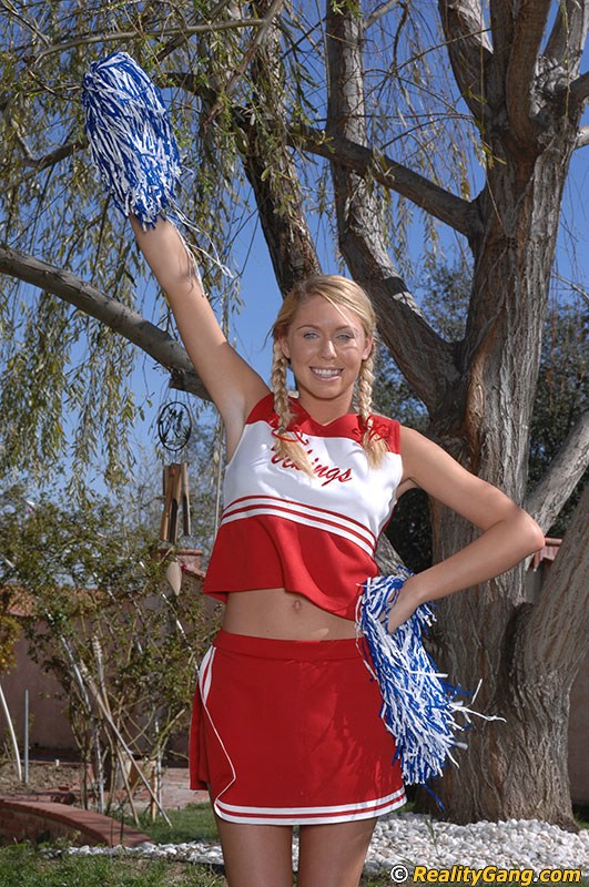 Brynn Tyler takes her slutty cheerleader outfit on the field and jumps on big dong.
