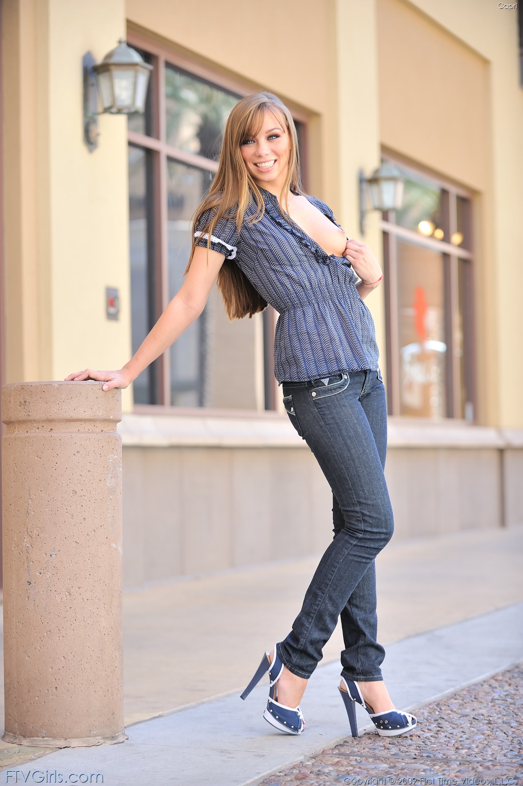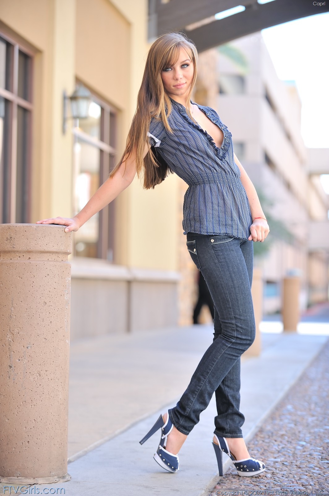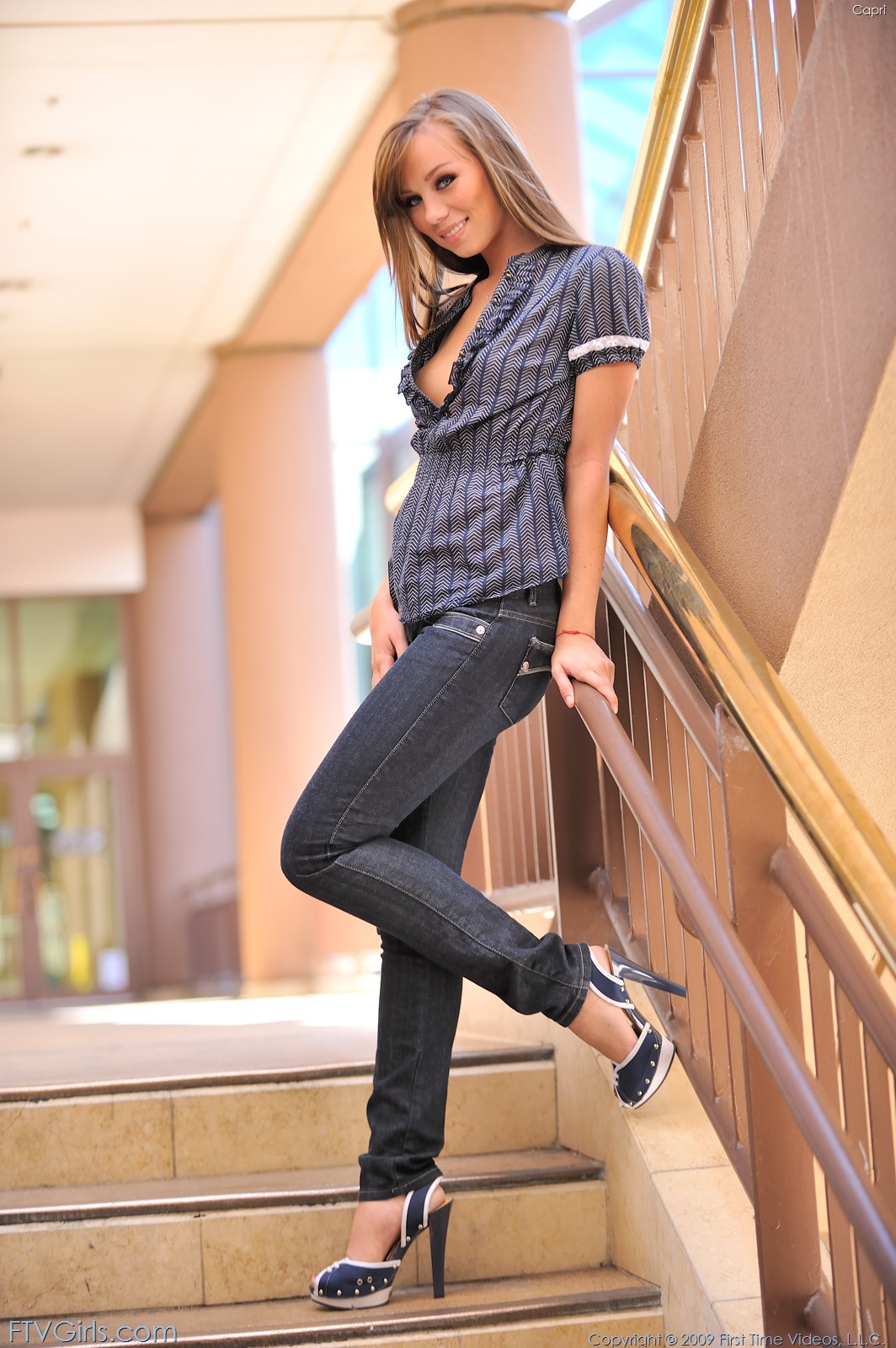 Capri Anderson posing in a blue shirt adn blue jeans and shows her tiny boobies.