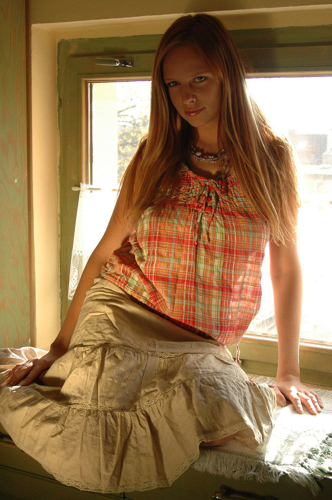 Busty blonde babe Carmen Gemini strips her mini skirt and shows her fresh muff.