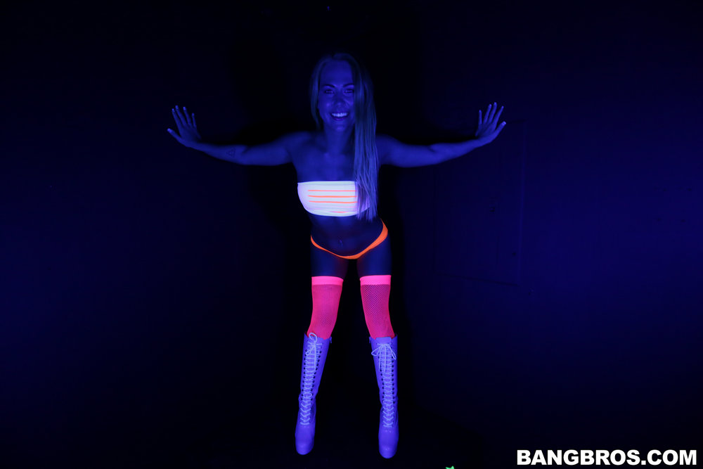 Blondie in a fluorescent outfit opens her mouth and pussy to take a dong after a disco