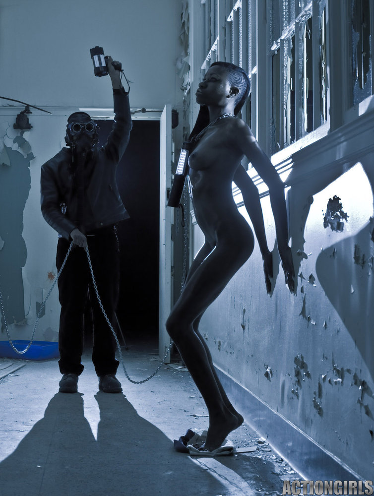 Masked dude cages and ties up a skinny babe in order to turn her naked body into masterpiece