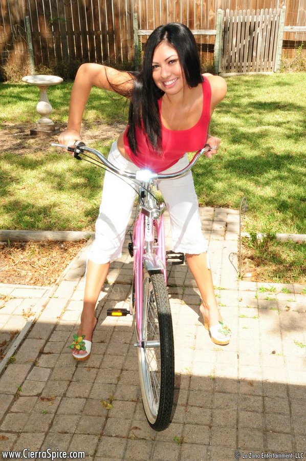 Busty brunette Cierra Spice with hard nipples under red t-shirt posing on bike.