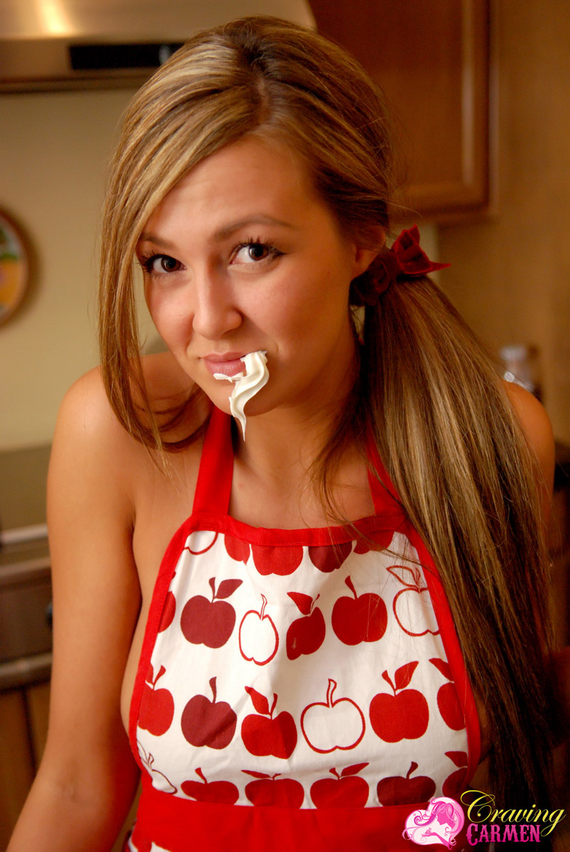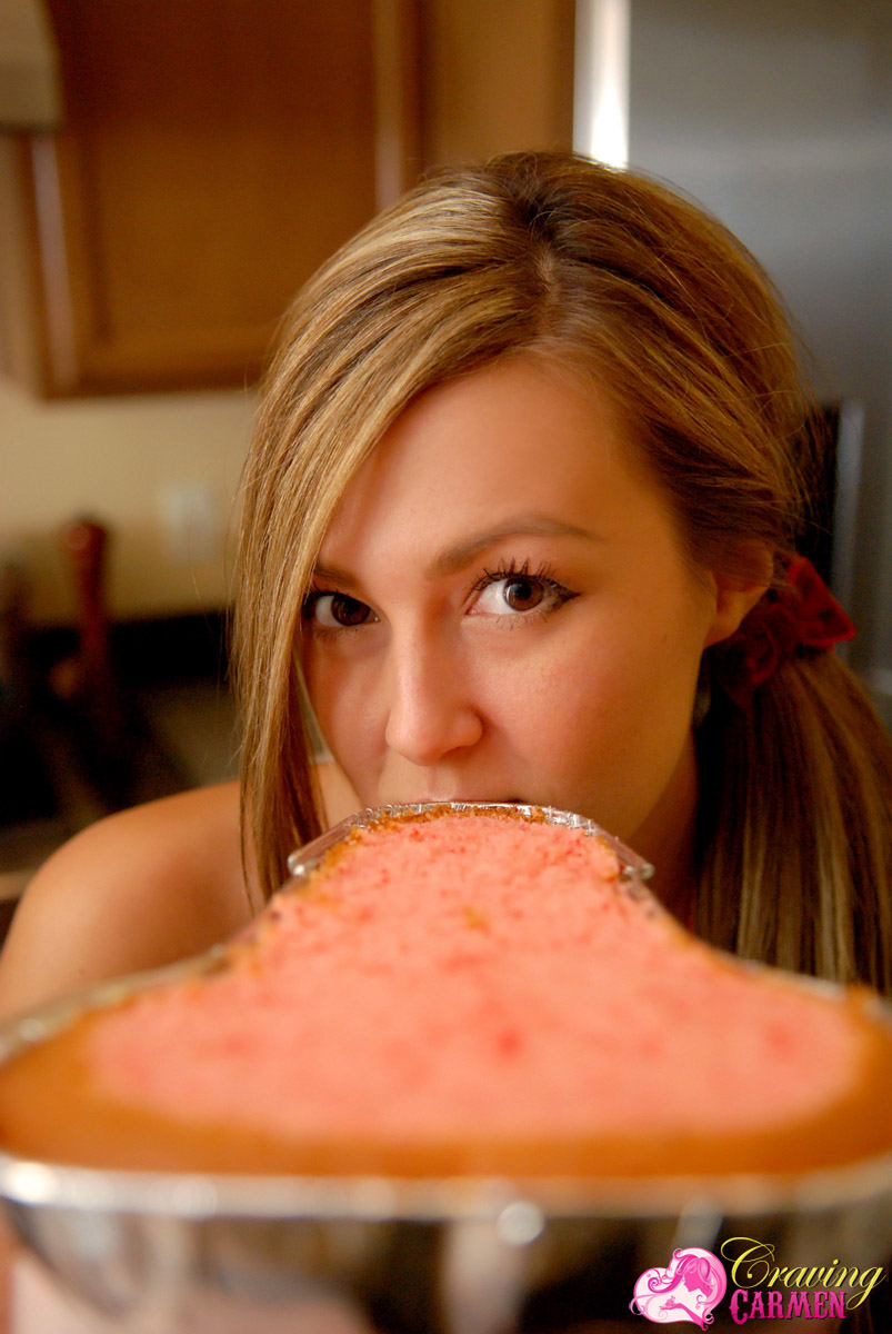 Lovely blonde babe Craving Carmen takes off her clothes in the kitchen and shows off.