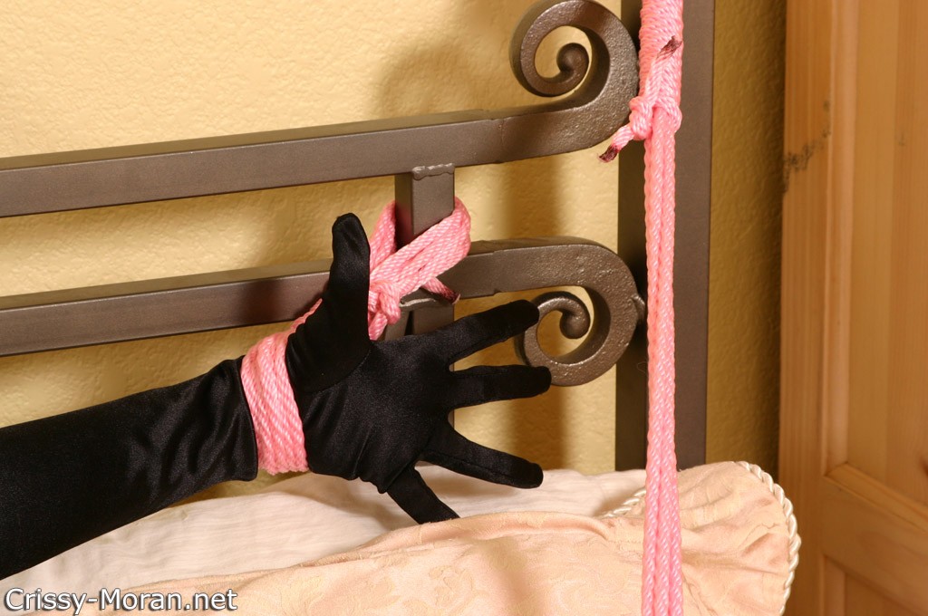 Cute and sexy babe, Crissy Moran bounded to her bed wearing sexy black fishnets.