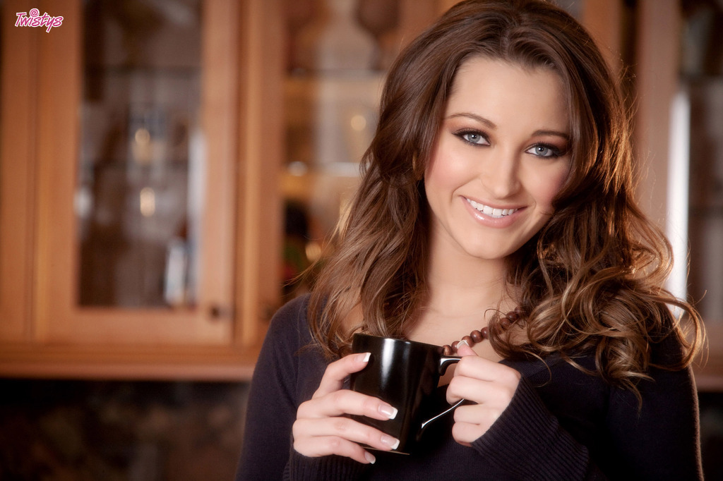 Dani Daniels thrusts a long finger into her slit while drinking morning coffee.