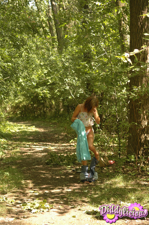 Cute teen gal Diddylicious takes off her clothes in the woods and shows off.