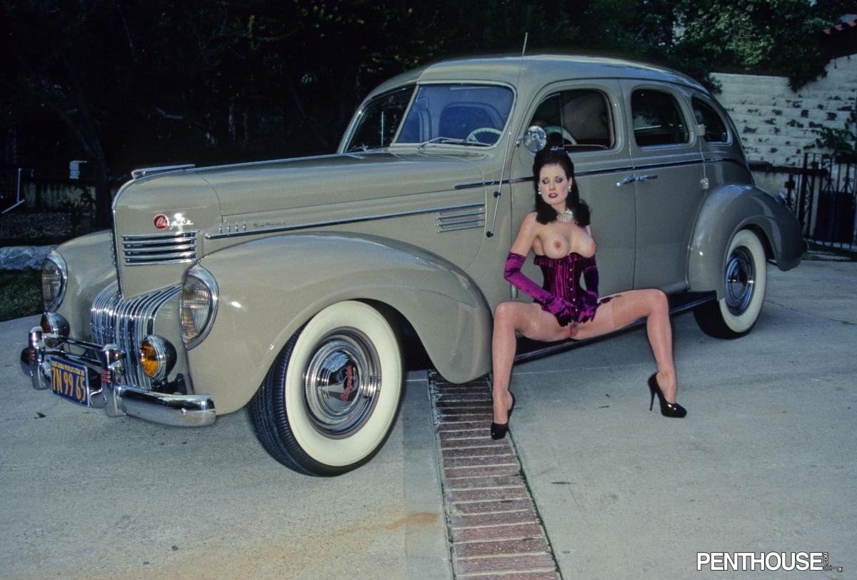 Devliish diva Dita Von Teese shows off in a corset with no panties by the car.