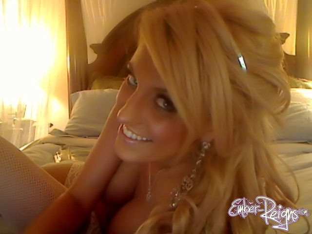 Classy blonde babe Ember Reigns strips on the bed and teases in white lingerie.