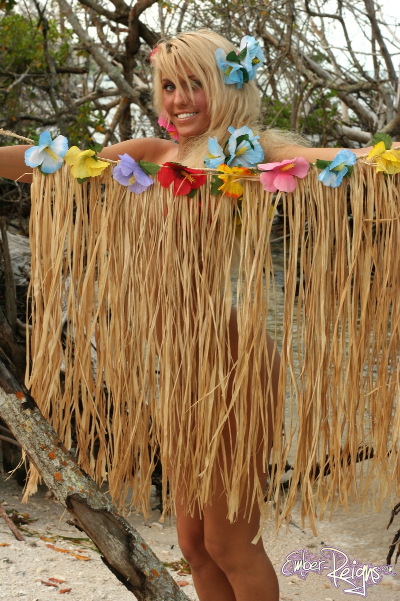 Hot blonde model Ember Reigns strips her hawaian clothes and shows her big jugs.