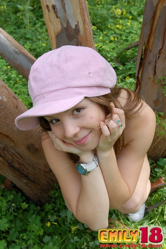 Cute teen gal Emily 18 takes off her bra in the woods and shows her perky jugs.