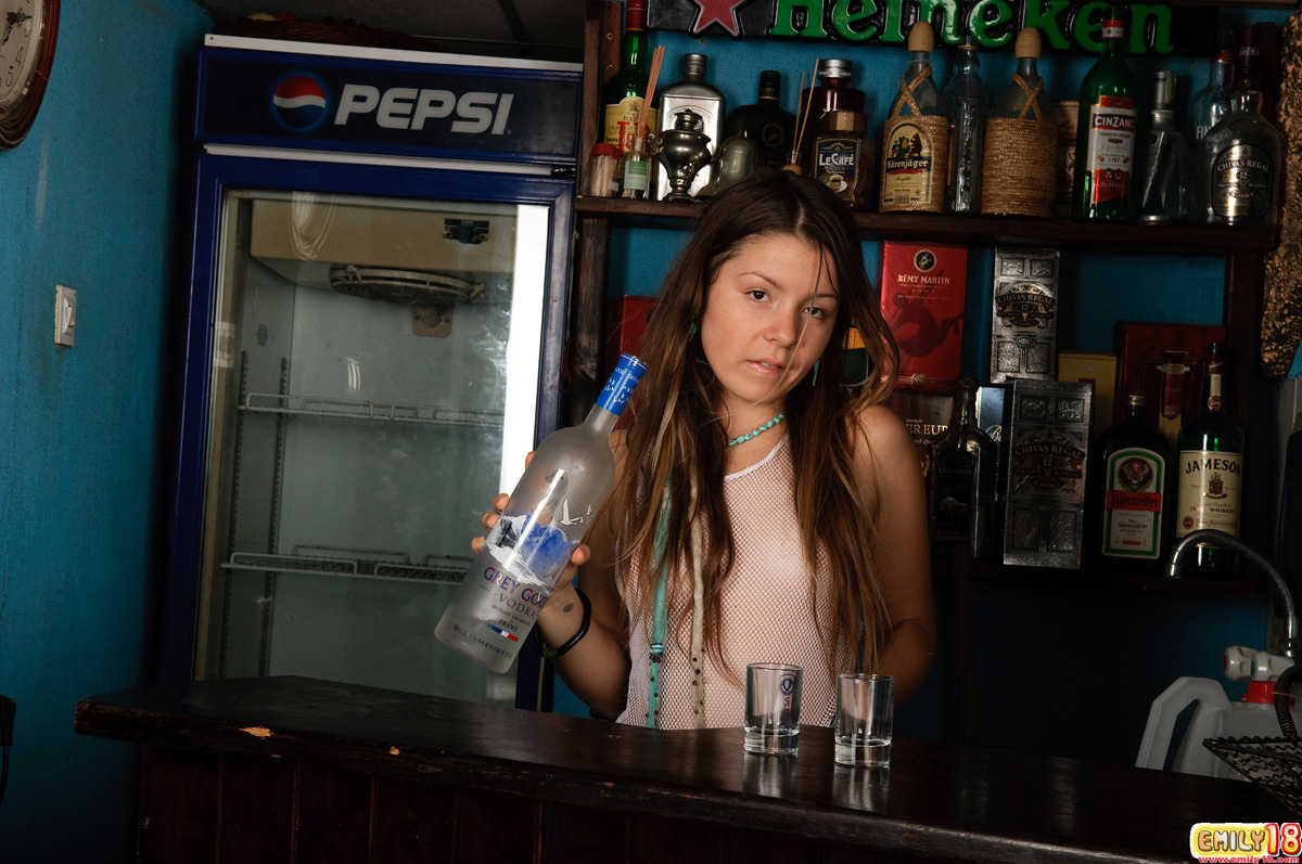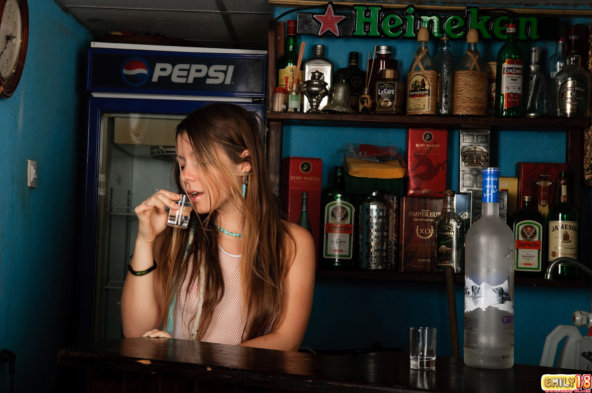 Cute teen babe Emily 18 strips in the bar and shows her fantastic curvy body.