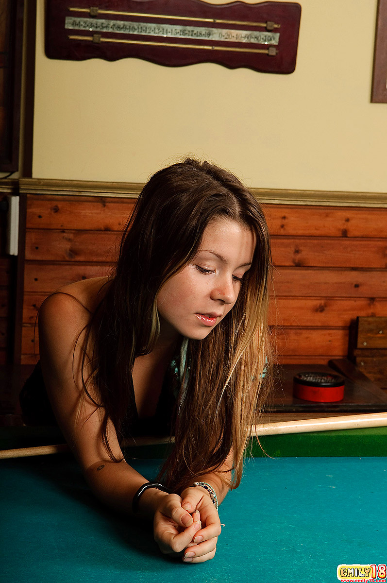 Hot blonde model Emily 18 takes off her black dress on the pool table and shows off.
