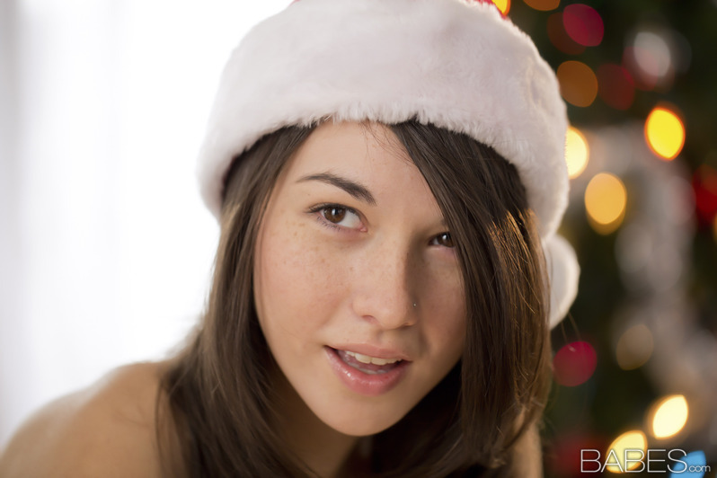 Busty babe having small tits is taking off her Santa's uniform and touching her gorgeous body