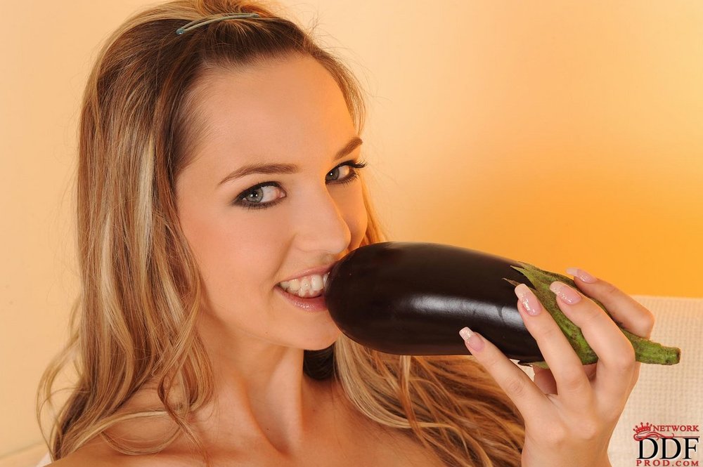 Aroused Erica Lightspeed with nice tits and hot body sticking an eggplant up her twat.