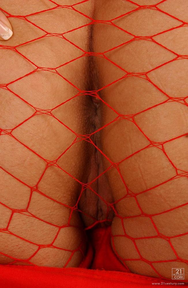 Eve Angel removes her sexy red fishnet lingerie and toys her gaping wet pussy.