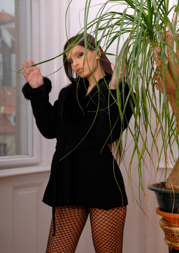 Attractive brunette babe Eve Angel strips her black bodystockings and shows off.