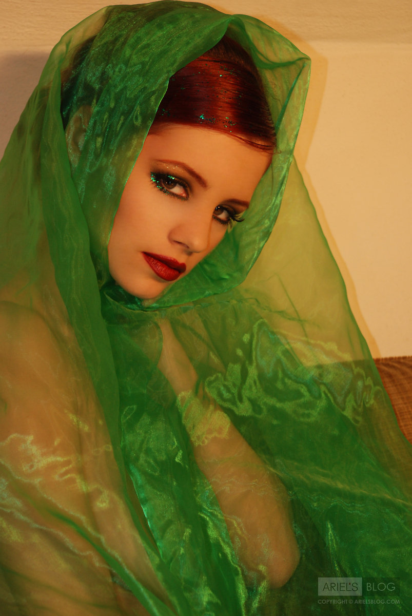 Sexy redhead honey Gabrielle Lupin in green silk veil showing her great bazookas.