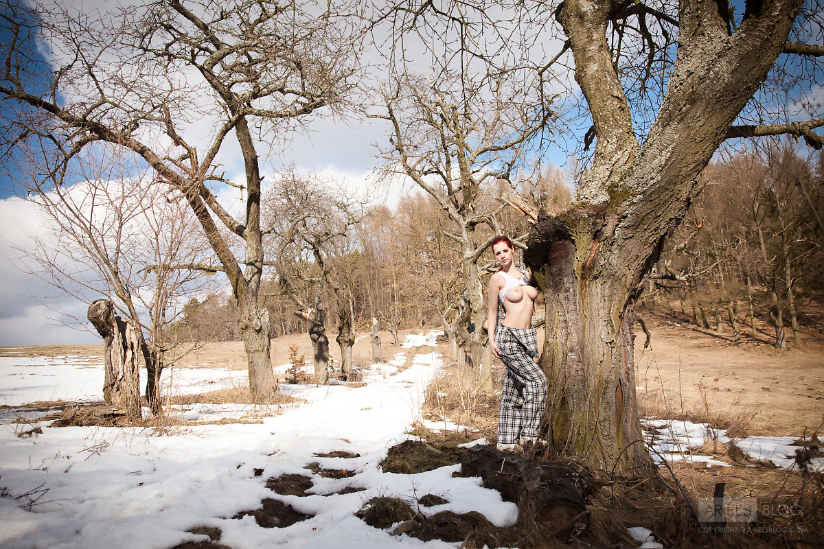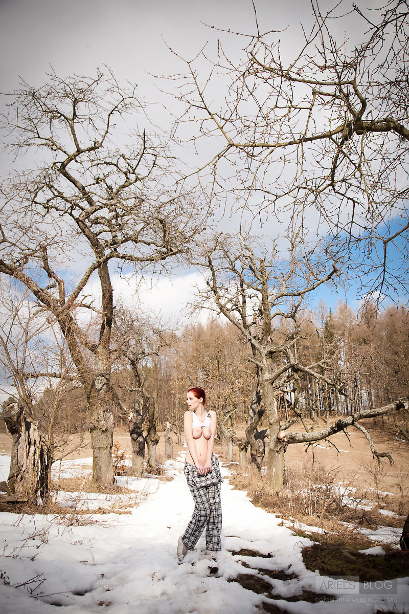 Great looking redhead Gabrielle Lupin lifting t-shirt and showing boobies outdoor.
