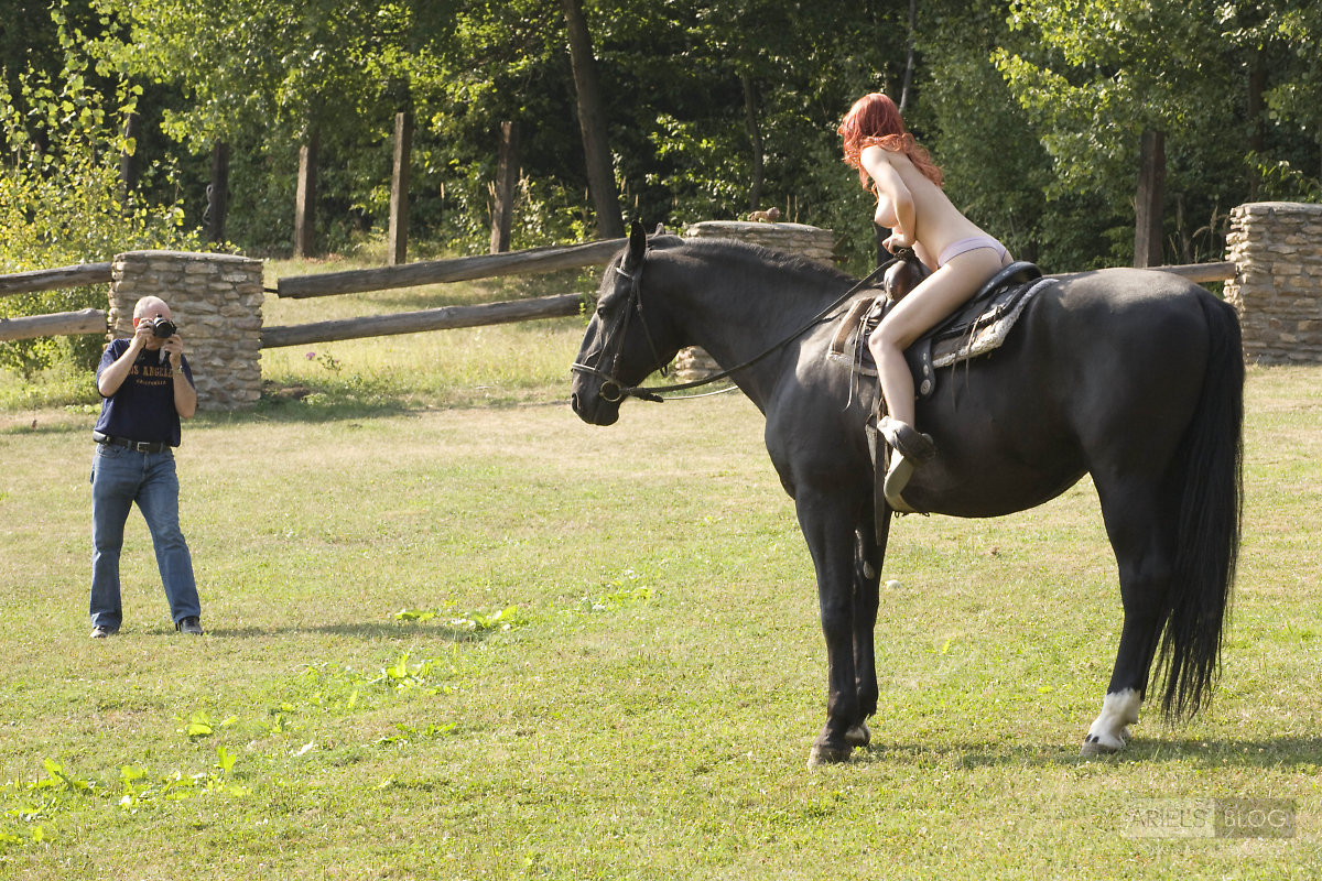 Passionate and sexy redhead Gabrielle Lupin rides a horse outdoors fully nude.