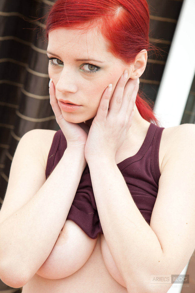 Attractive redhead hottie Gabrielle Lupin stripping and showing her shaved twat.