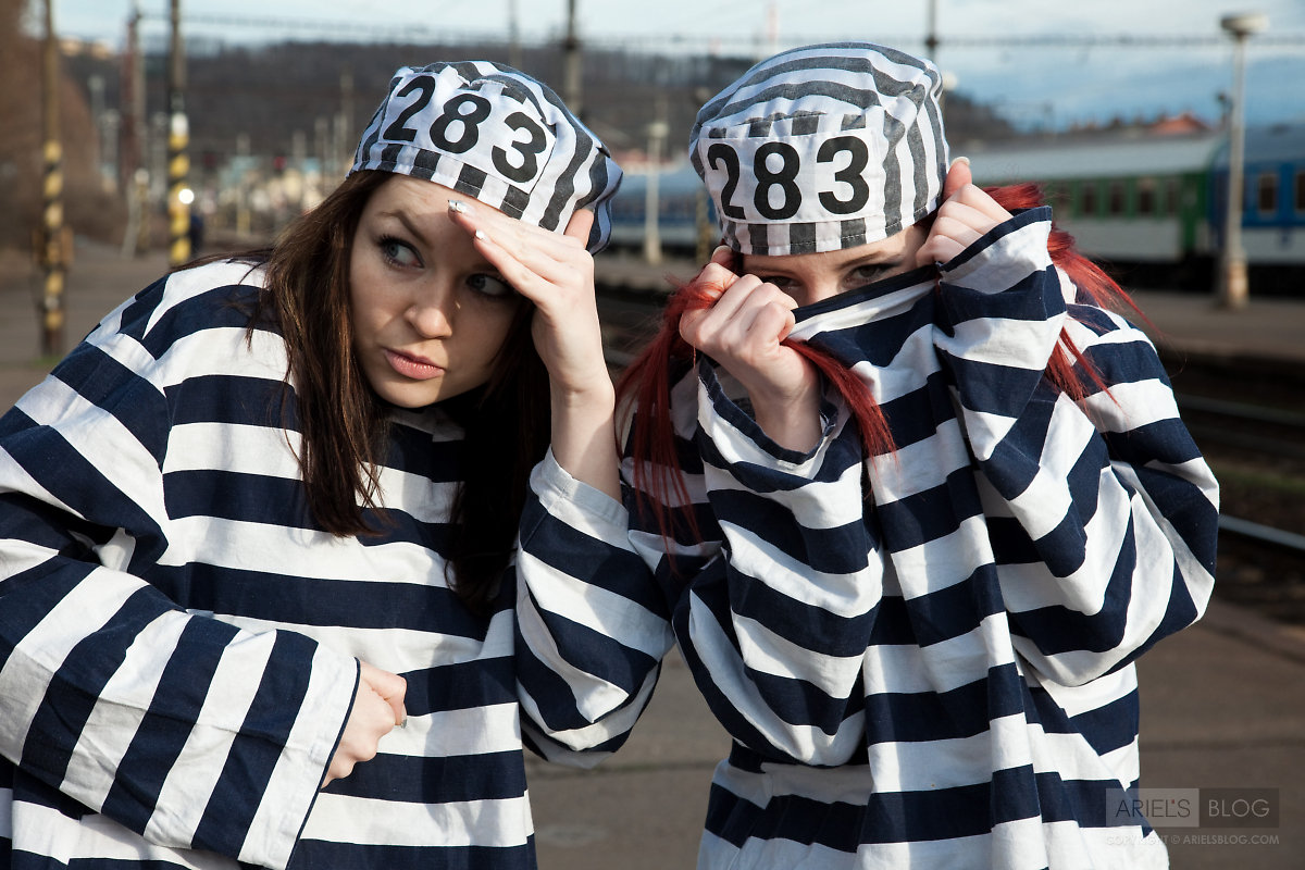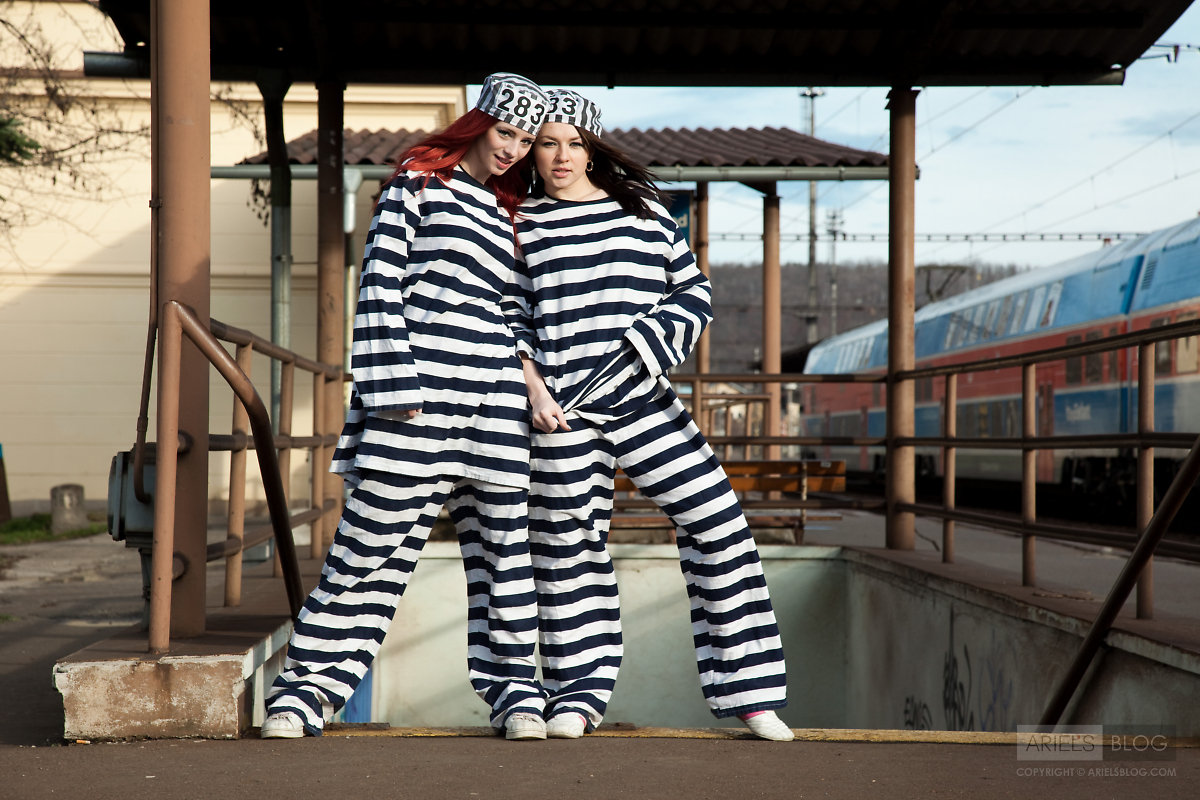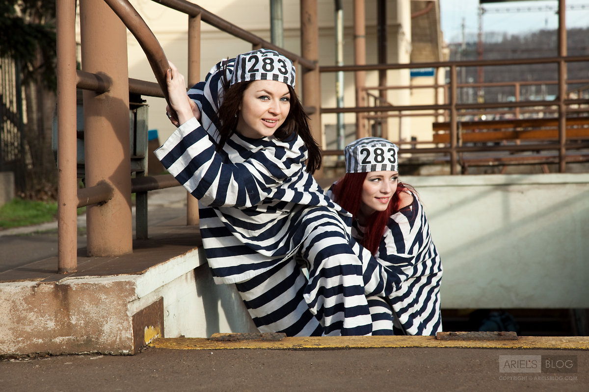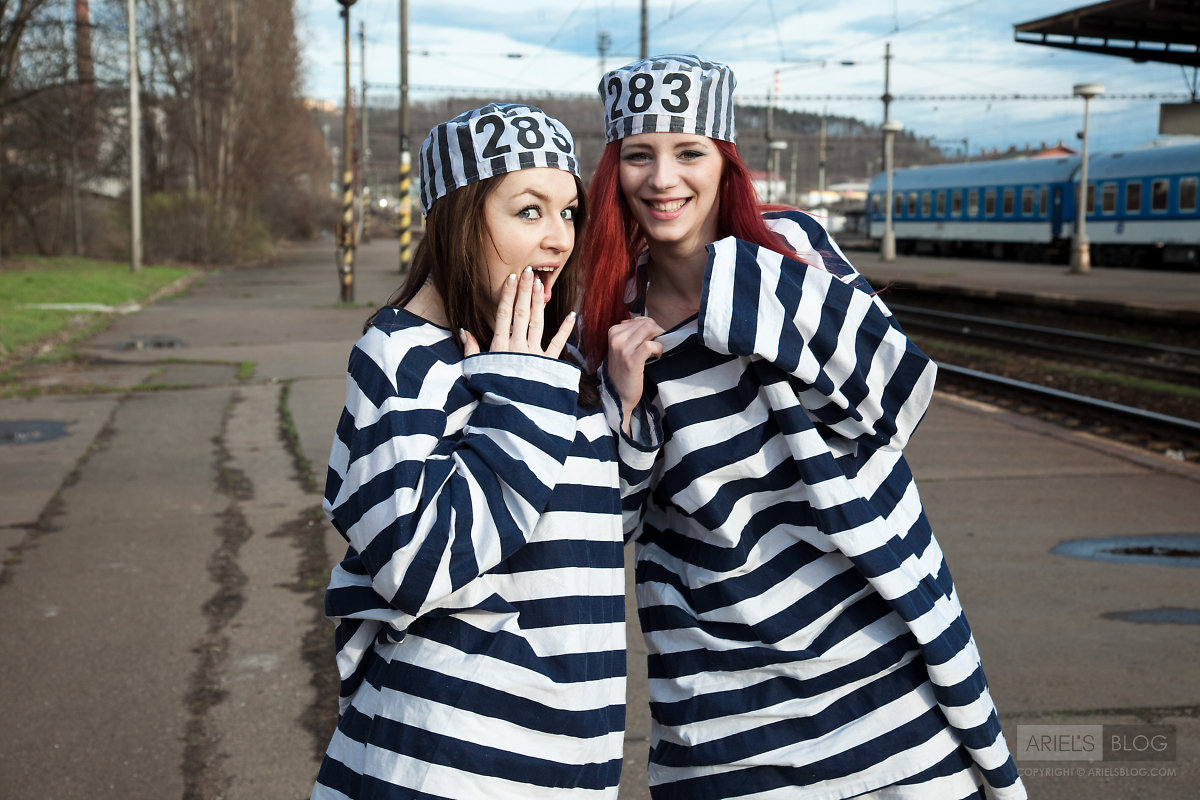 Foxy teen babe Gabrielle Lupin poses with her friend in sexy prisoner outfit.