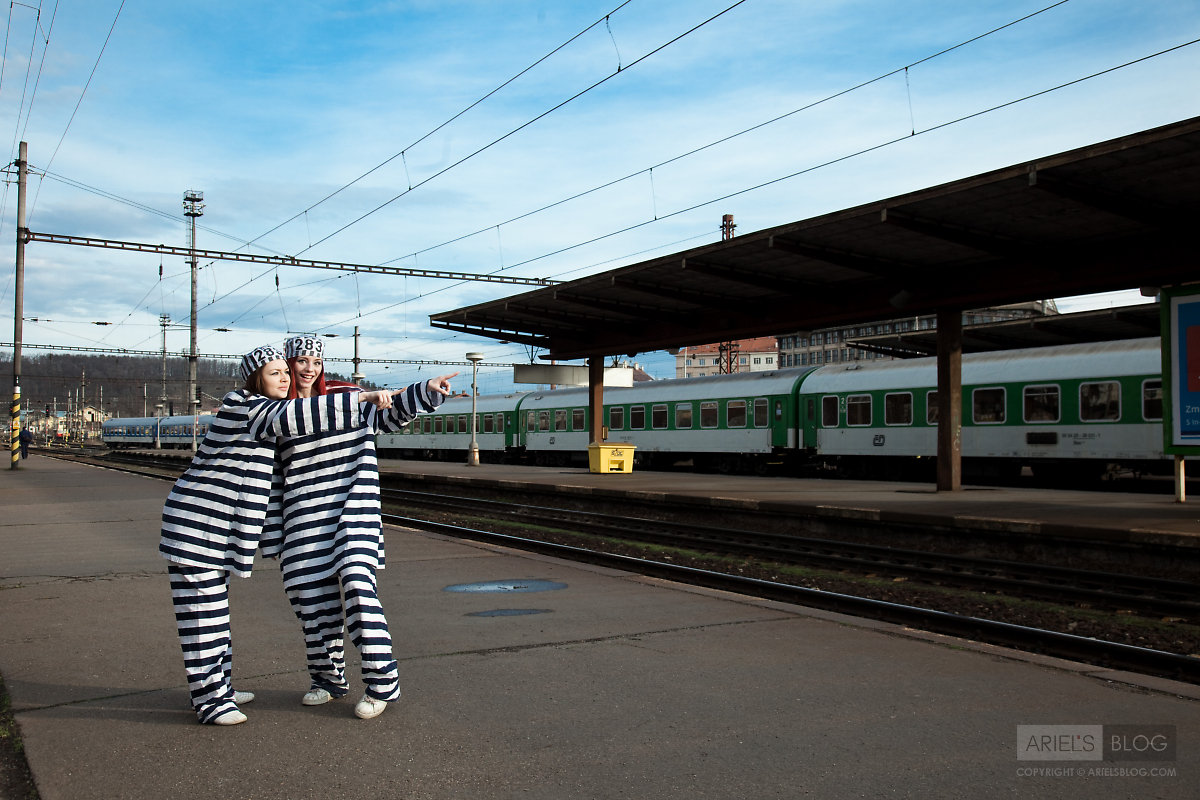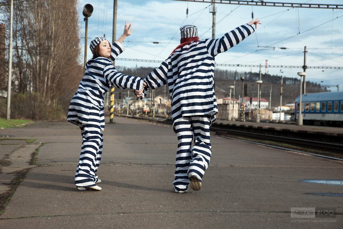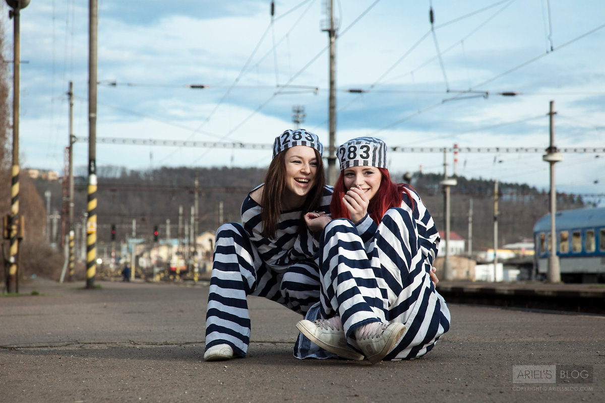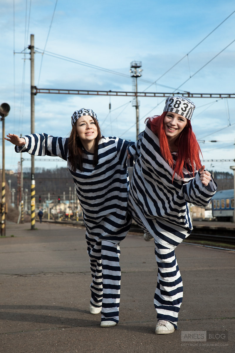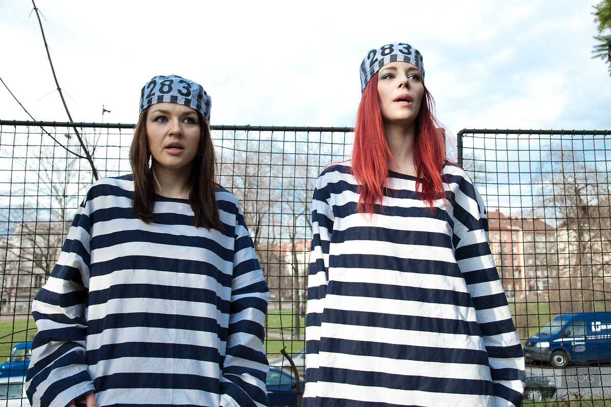 Foxy teen babe Gabrielle Lupin poses with her friend in sexy prisoner outfit.