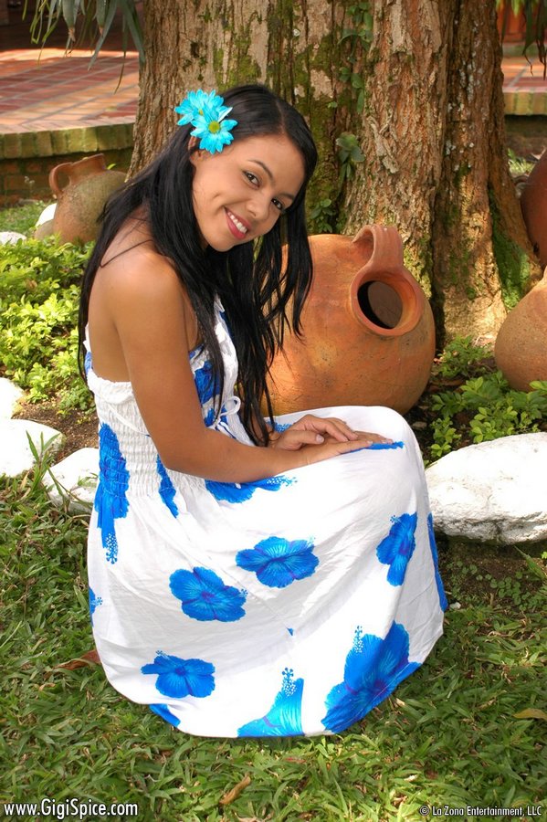 Teenage looking brunette Gigi Spice lifting flowery dress and showing sexy booty.