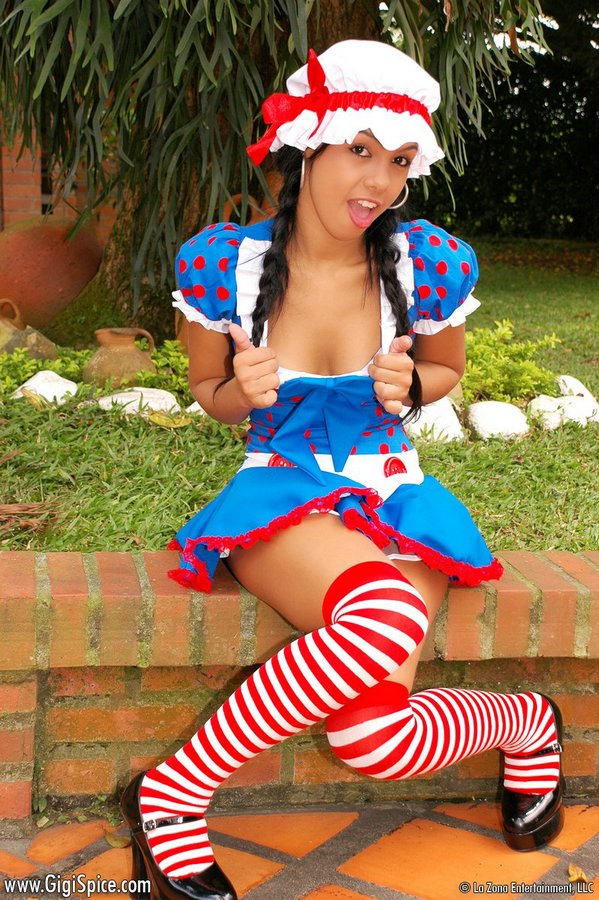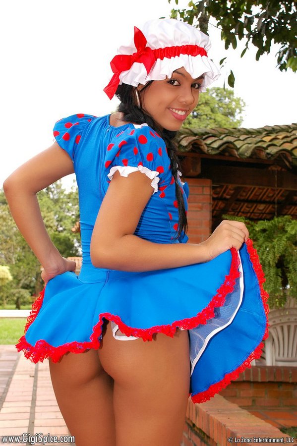 Playful brunette Gigi Spice in costume lifting skirt and showing delicious tushy.