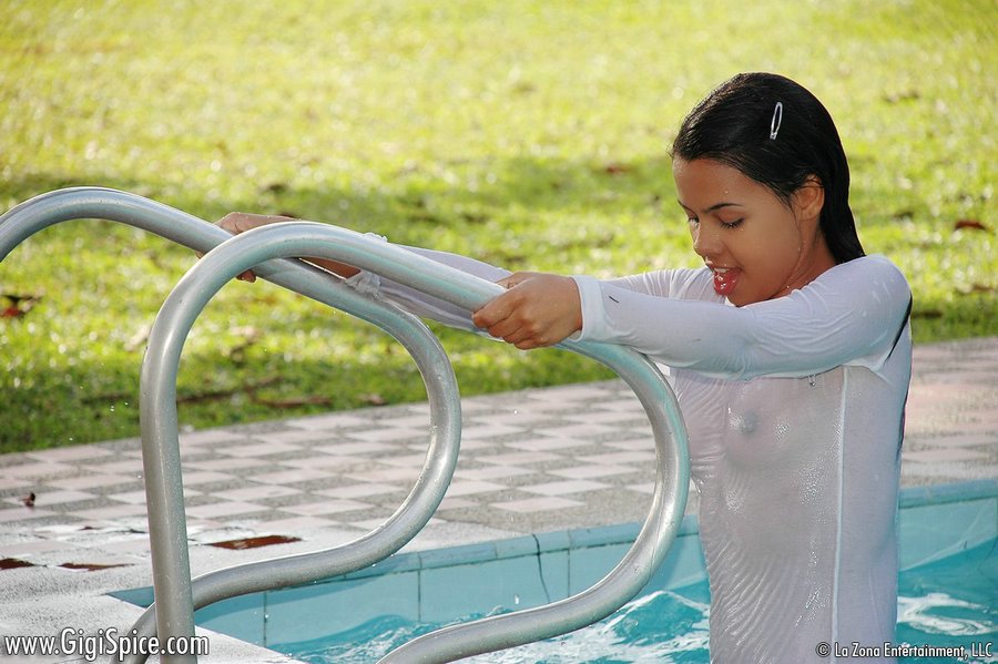 Playful brunette Gigi Spice with sexy booty wearing white shorts posing in pool.