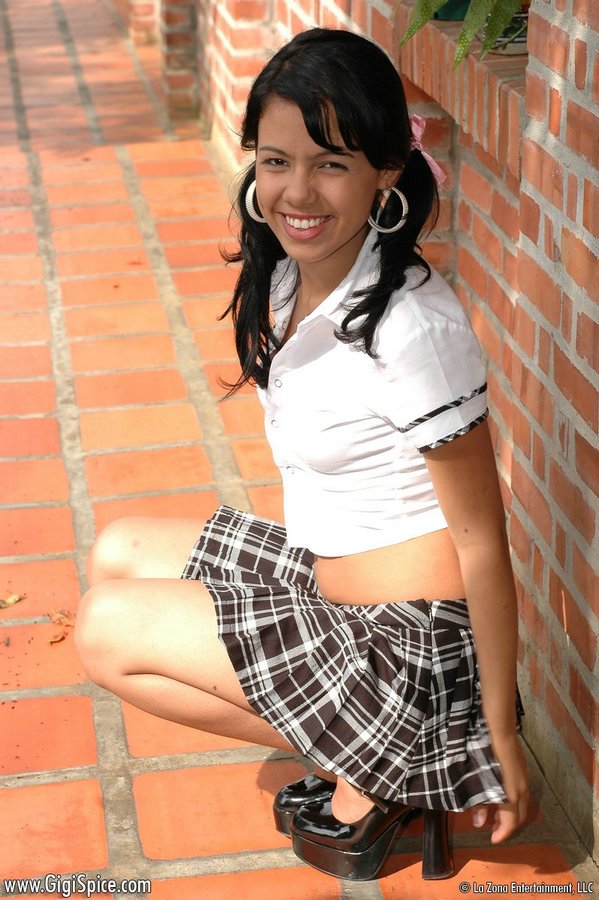 Naughty school girl brunette Gigi Spice in sexy uniform showing her attractive body.