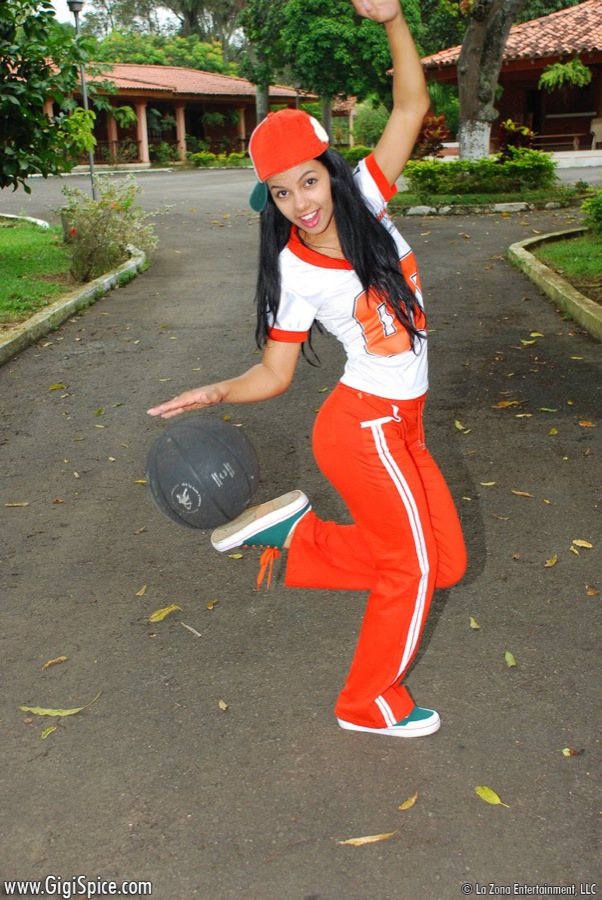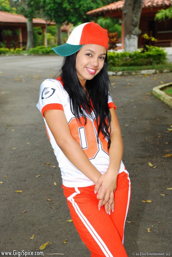 Bootylicious tanned brunette Gigi Spice in sporty outfit showing shaved cunny.