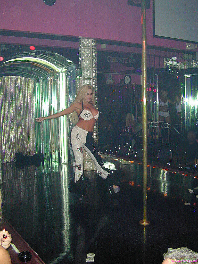 Busty tanned blonde pole dancer Gina Lynn doing der sexy striptease in white thong.