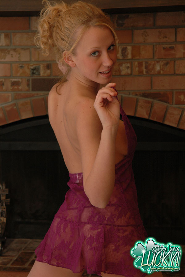 Beautiful blonde gal from Gotta Love Lucky takes off her purple dress and shows off.