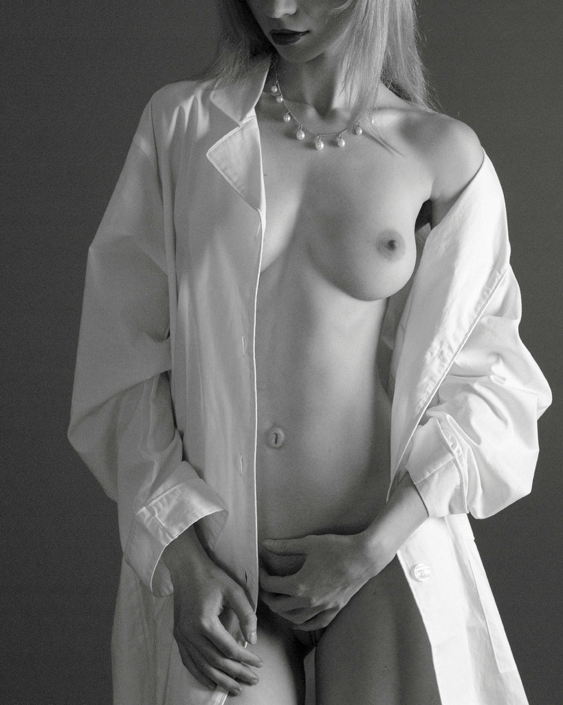 Jane A strips her sexy white coat and seduces us with her divine round breasts.