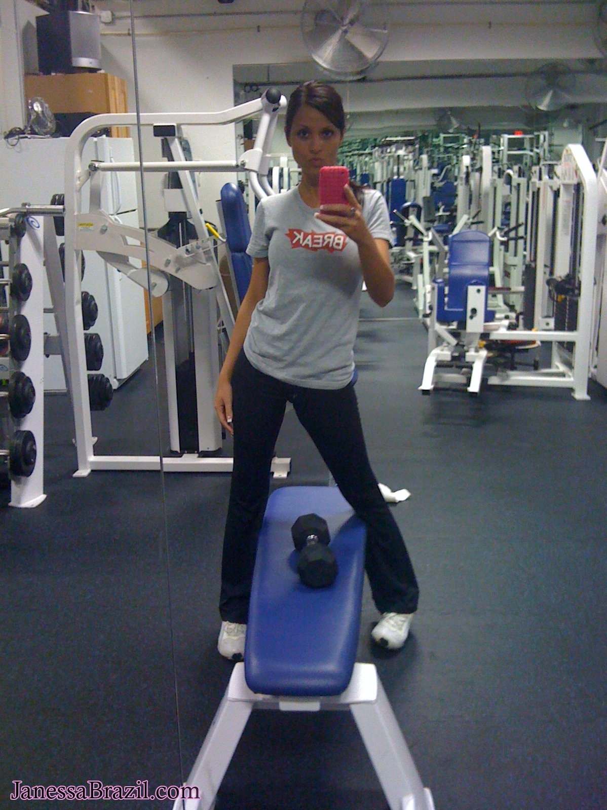 Attractive teen cuttie Janessa Brazil strips in the gym and teases in purple thongs.