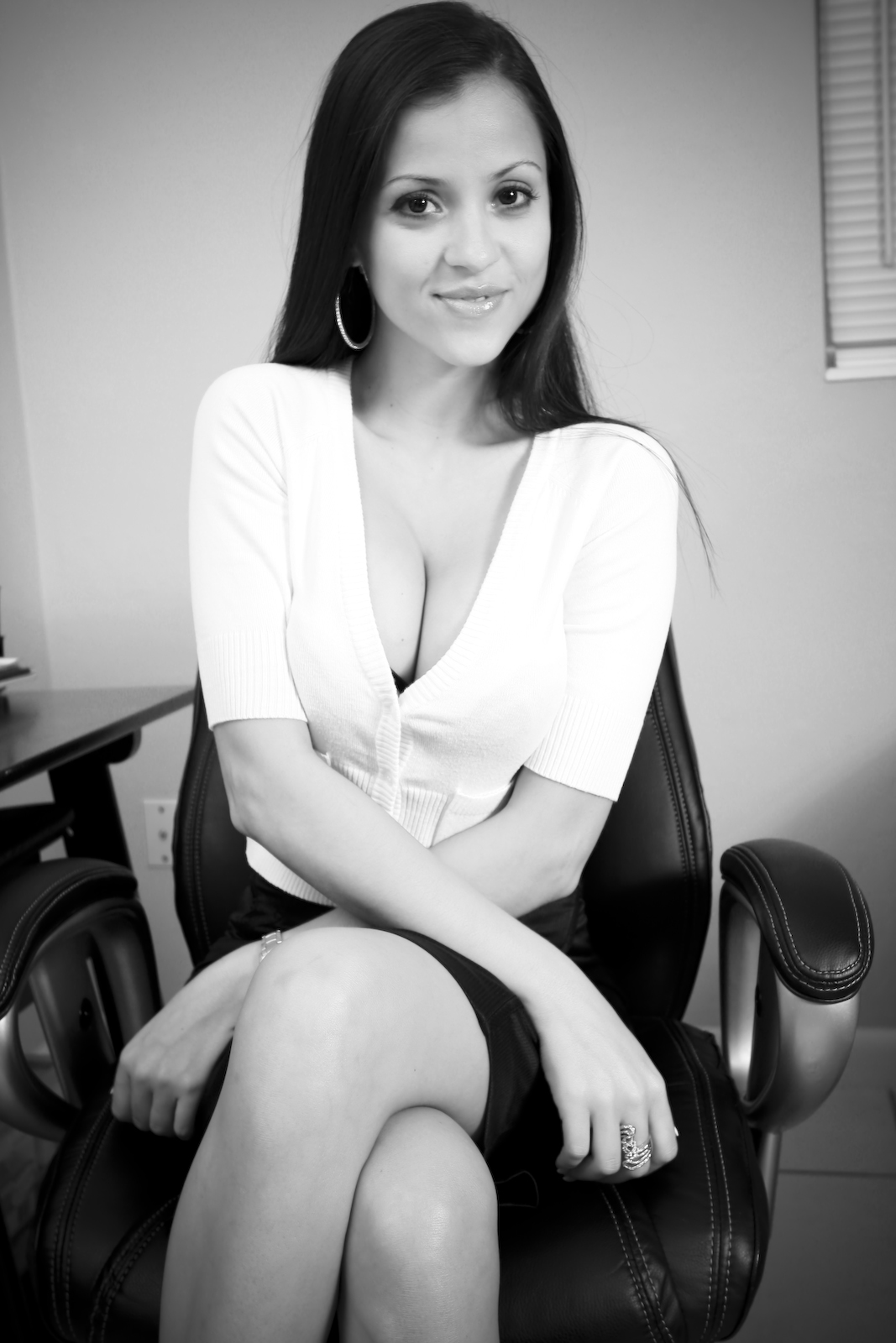 Beautiful brunette cuttie Janessa Brazil strips in the office and teases in thongs.