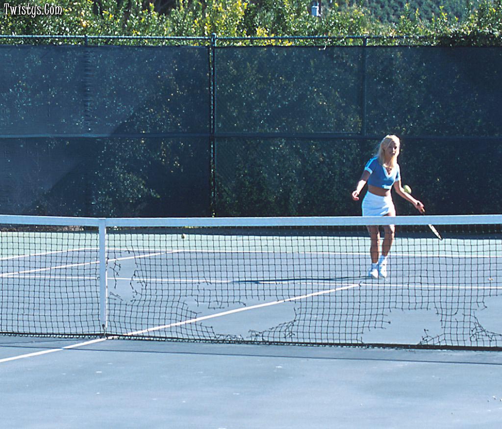 Slutty blonde tennis player Jeanie Rivers strips on the court and rides fat penis.