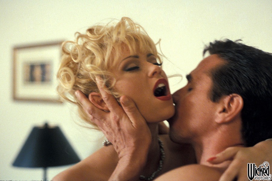 Classy blonde pornstar Jenna Jameson moans hard as she gets banged on the bed.