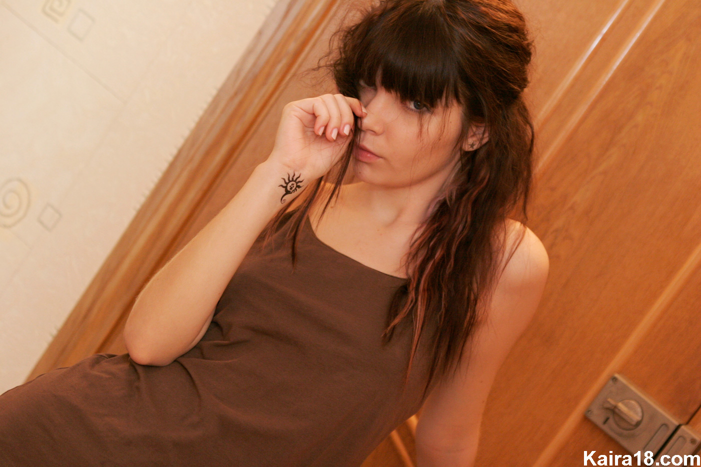 Seductive emo gal Kaira 18 takes off her panties and shows her fuckable muff.