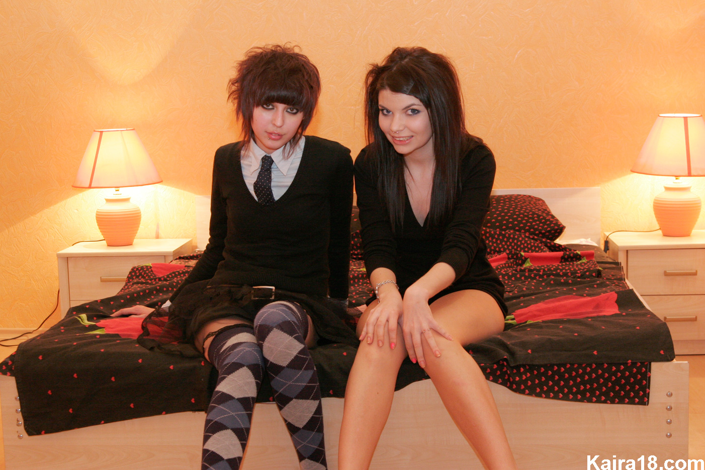Horny emo babe Kaira 18 takes off her schoolgirl outfit and makes out with her friend.