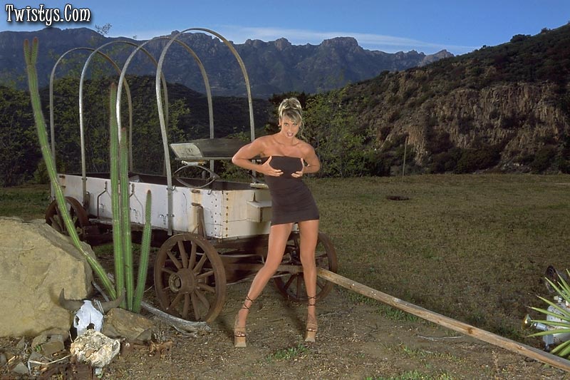 Good looking busty blonde Kara Styler strips outdoors and shows her tight ass.