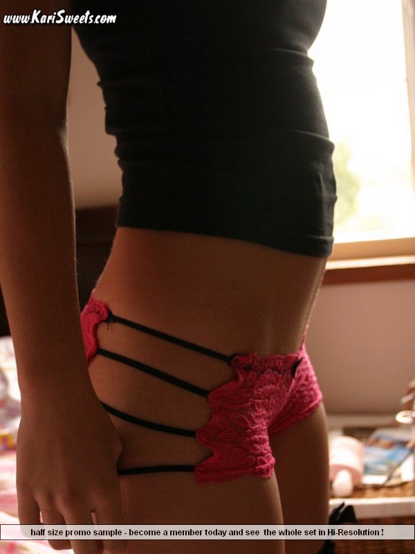 Cute teen gal Kari Sweets strips her pink panties and shows her tight booty.