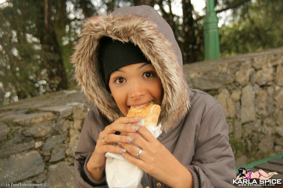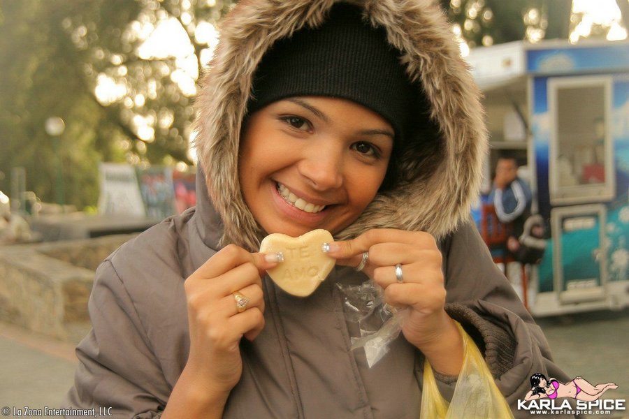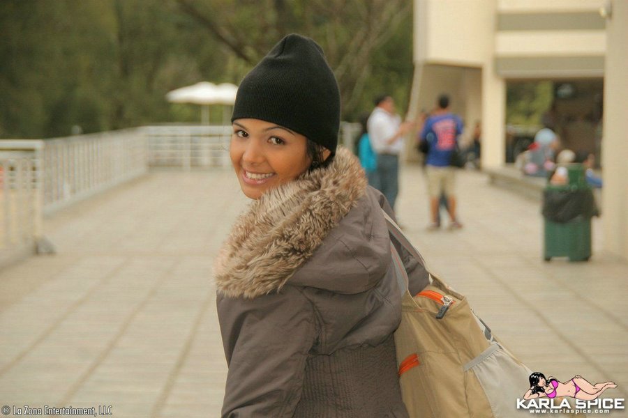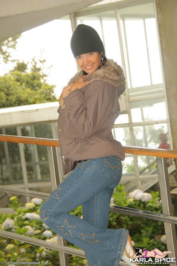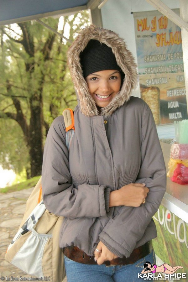 Sexy brunette hottie Karla Spice showing her big boobies under winter jacket.