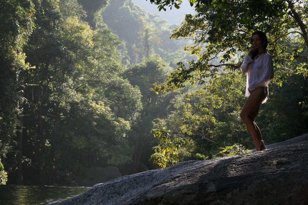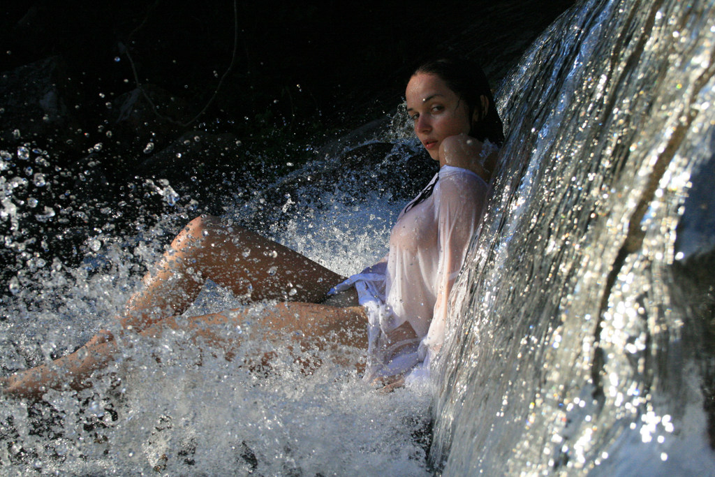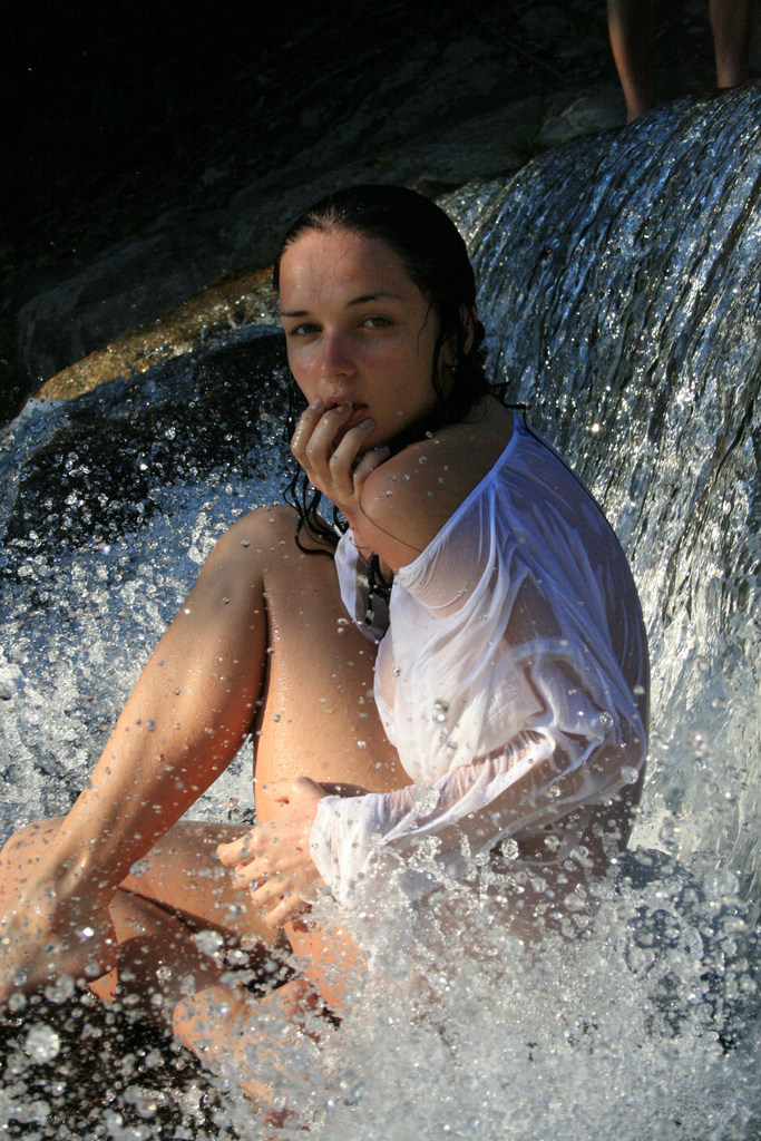 Hot brunette chick Katie Fey strips for the camera and shows us her jugs outdoors.
