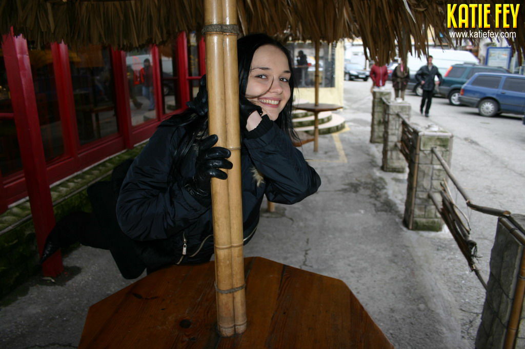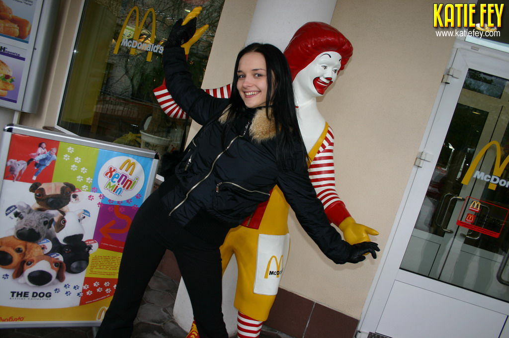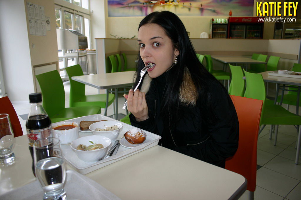 Hot brunette babe Katie Fey eats at McDonald's and then strips her black clothes.
