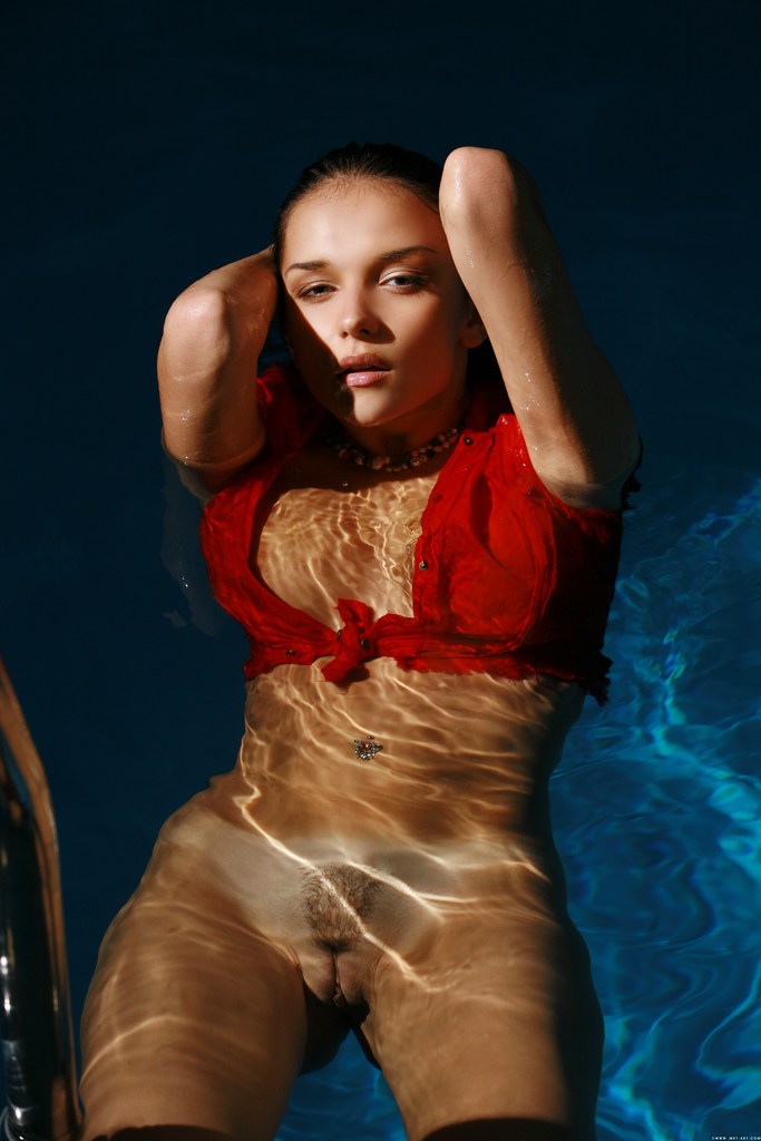 Alluring brunette cuttie Katie Fey strips in the pool and shows her big melons.