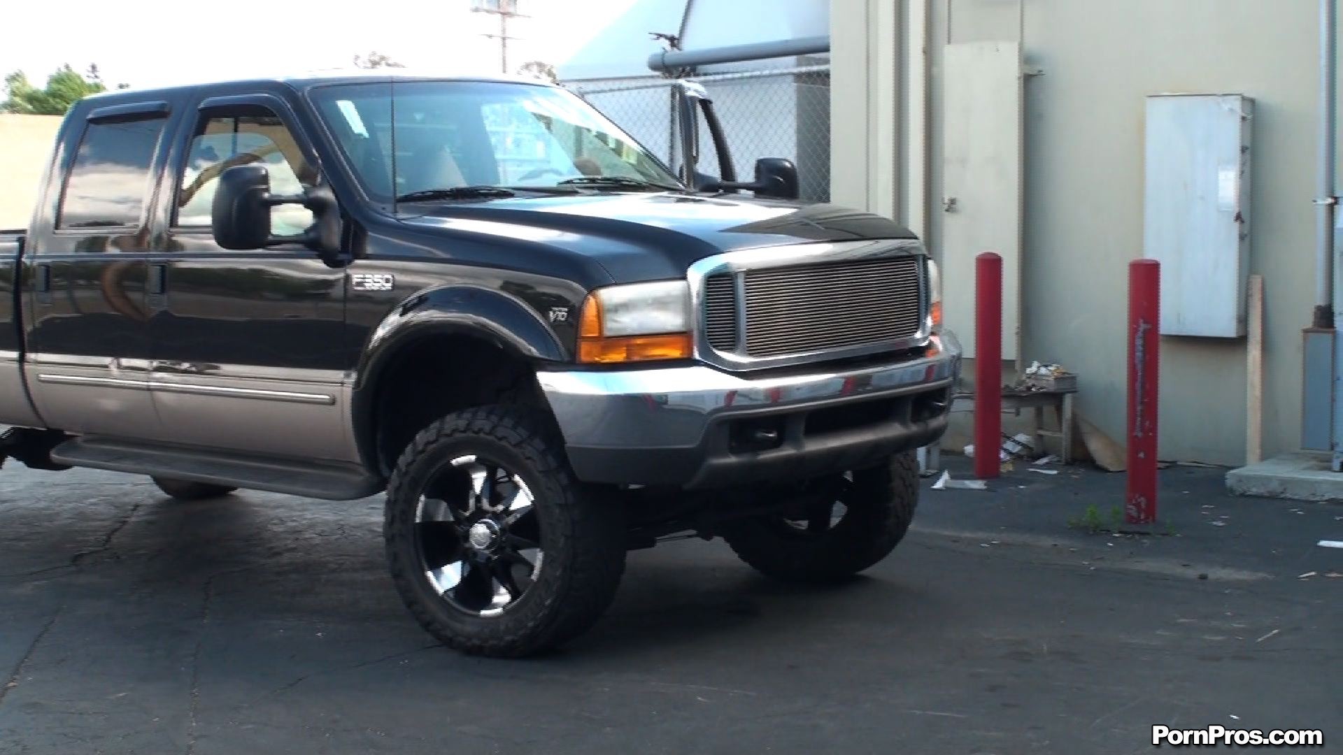Muscular lad makes blonde lean against his big car to fill her shaved pussy with his big cock