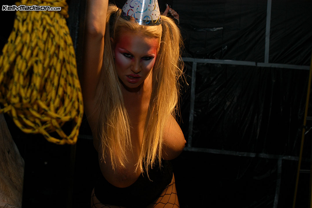 Lusty big breasted blonde Kelly Madison teases wearing sexy black corset and fishnets.